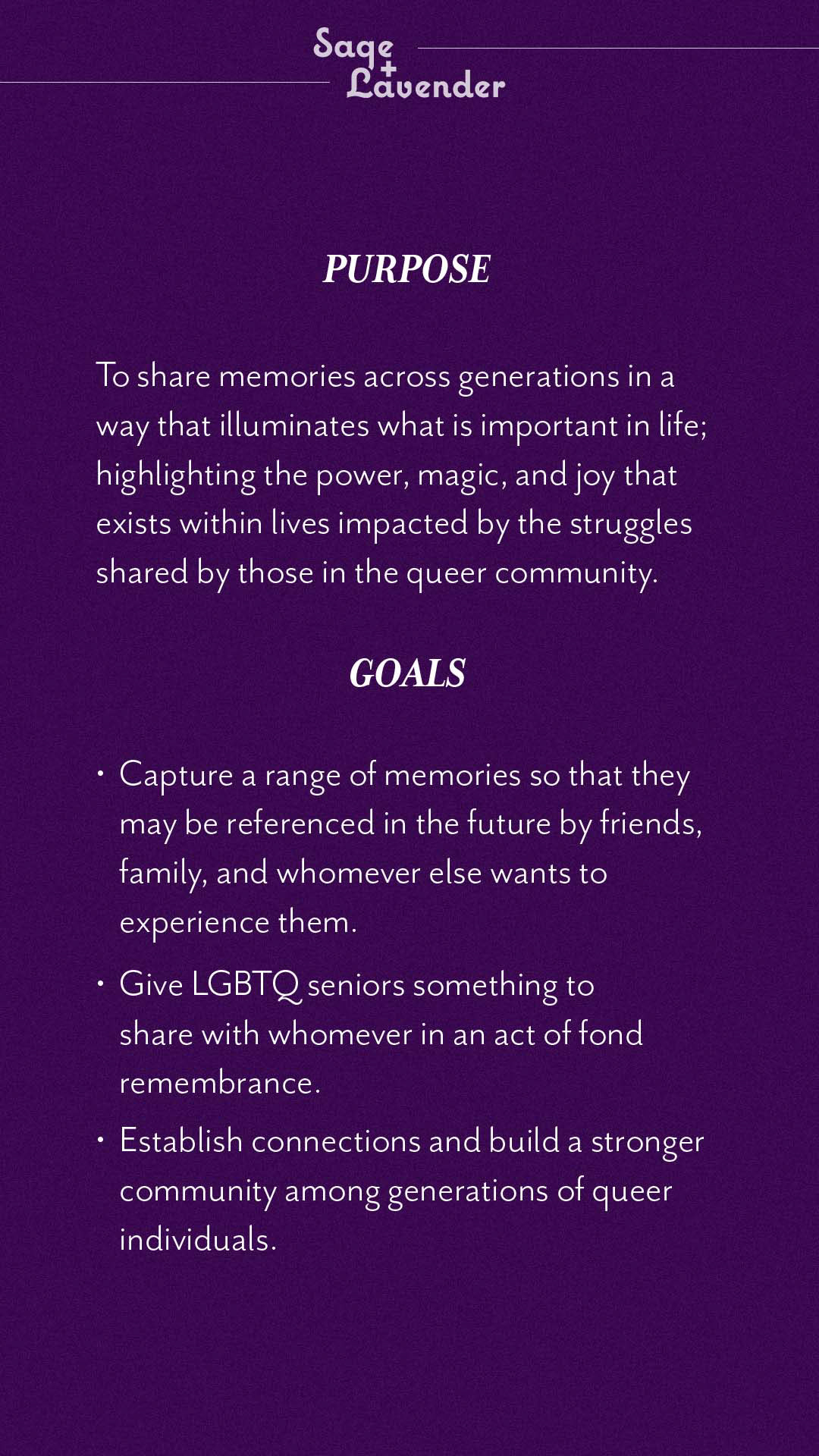 Sage & Lavender is an LGBTQ oral history video series I created. It features guided, cross-generational conversations between LGBTQ folks in an effort to provide a collection of memories for hosts to share with their family and friends so their memories can live on past their lifetime. It is an ongoing project with videography support from Paris Brown Films (www.parisbrownfilms.com).